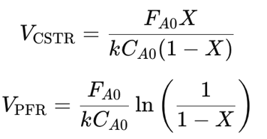 CSTR requires larger volume than a PFR for the same conversion (for first-order reactions).