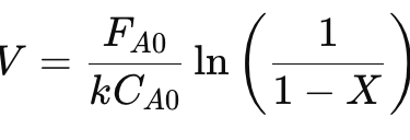 This calculator helps determine the reactor volume (V) required to achieve a specified conversion (X) for a first-order reaction, given flow rate, concentration, and rate constant.
