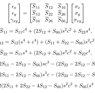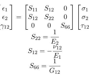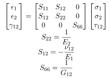 Compliance Matrix [S]: This matrix represents the material’s response in terms of strains per unit stress. In composites, the compliance matrix is often anisotropic, meaning it has different properties along different axes. The components of [S] reflect the elastic properties of the composite material along its principal directions.