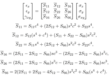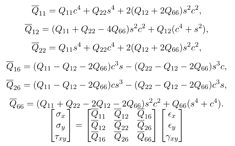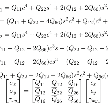 Transformed Reduced Stiffness Matrix [Q̅]: This matrix is used when layers in a composite laminate have fibers oriented at various angles. [Q̅] combines the stiffness properties and transformation for a particular ply angle, allowing the calculation of stresses and strains in laminates with multiple orientations.