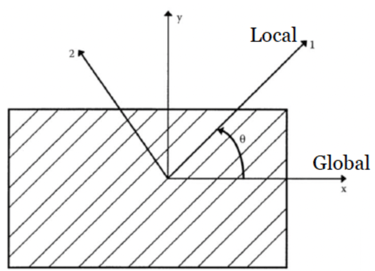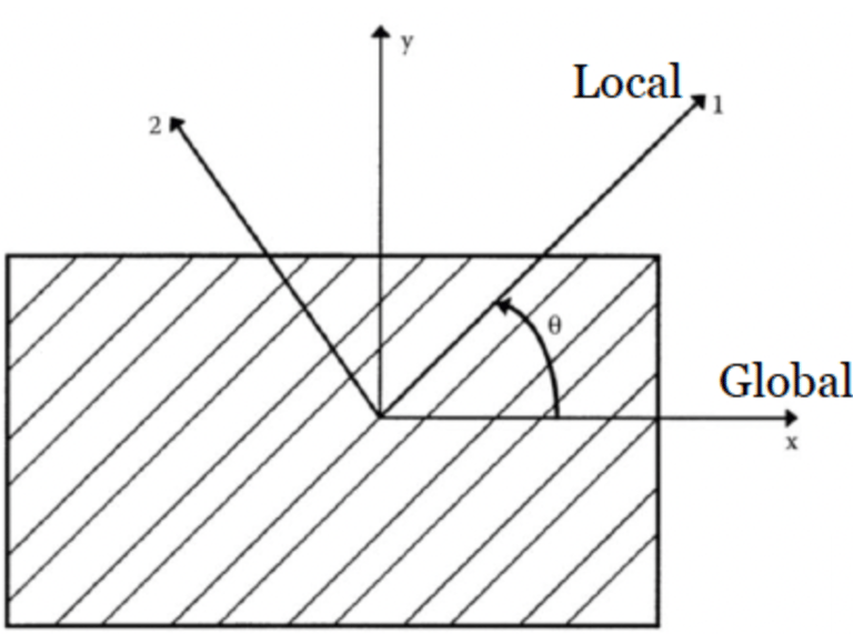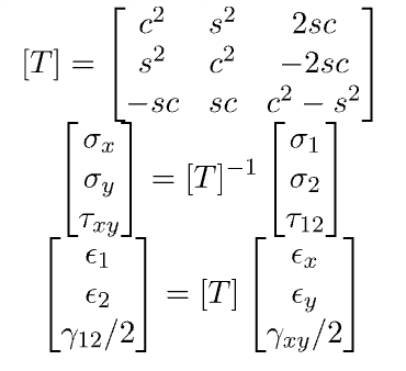 Transformation Matrix [T]: This matrix is used to relate stresses and strains between the global and local coordinate systems of a composite lamina. Given an angle θ, which represents the orientation of the fibers, the transformation matrix [T] uses cos(θ) and sin(θ) to convert global stresses (σx,σy,τxy) into local stresses (σ1,σ2,τ12) and vice versa.