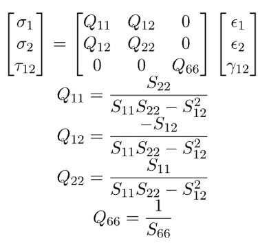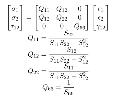 Reduced Stiffness Matrix [Q]: The inverse of the compliance matrix, the reduced stiffness matrix [Q] relates stresses to strains directly within the local coordinate system. It provides the stiffness properties of the composite in the fiber direction, transverse direction, and shear.