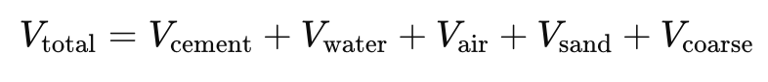 Concrete mix design often uses the absolute volume method, where: