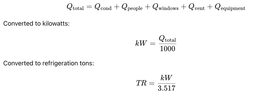 A Cooling Load Calculator estimates the amount of heat (in kW or TR) that must be removed from a space to maintain a desired indoor temperature. Cooling load accounts for heat gain from walls, windows, people, appliances, and ventilation.