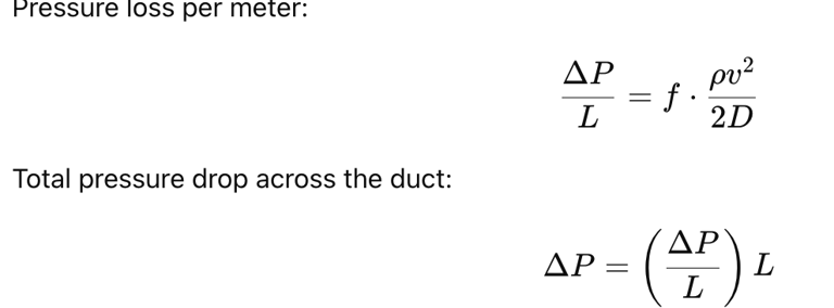 Duct pressure loss due to friction arises from shear stress between the moving air and the duct wall. The industry-standard model for evaluating this frictional loss is the Darcy–Weisbach equation, which applies to both laminar and turbulent flow.