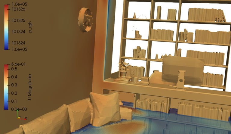 tensorHVAC-Pro supports both mechanical and natural ventilation scenarios. Airflow driven by fans, buoyancy effects, and wind pressure can be analyzed together, providing a realistic picture of indoor air movement. External airflow simulations further enhance this capability by showing how outdoor wind interacts with building openings and façades, influencing indoor ventilation performance.