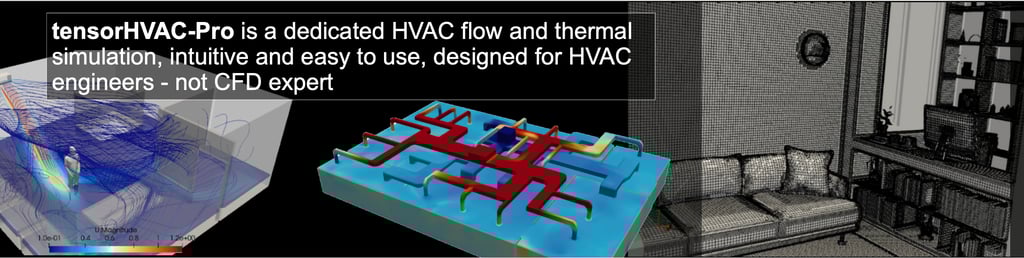 While this calculator provides a fast approximation of HVAC energy consumption, real buildings experience highly dynamic loads affected by airflow patterns, duct pressure losses, coil performance, room temperatures, ventilation rates, and thermal interactions. To analyze the true system behavior and optimize HVAC energy efficiency, tensorHVAC-Pro provides an advanced HVAC simulation environment—designed for HVAC engineers, not CFD experts. With tensorHVAC-Pro, you can visualize airflow, temperature distribution, ventilation effectiveness, and equipment interactions across the entire HVAC system to make data-driven energy optimization decisions.